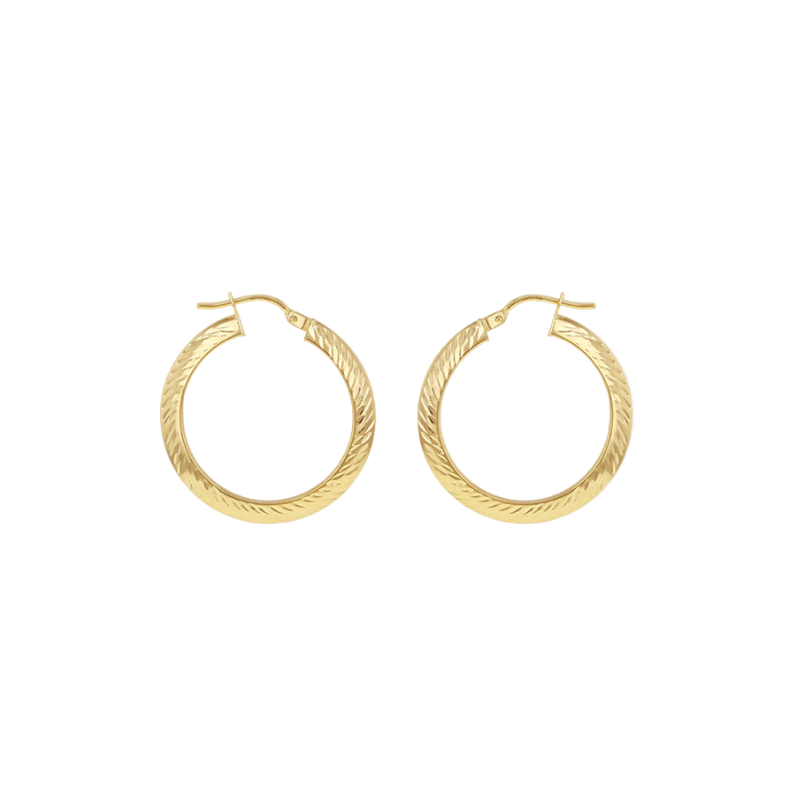 These classic 9ct yellow gold creole earrings feature a 15mm diameter with a subtle diamond-cut finish for added texture and shine. Designed with a hinged post fitting, they offer both comfort and security, making them an elegant choice for everyday wear or special occasions.