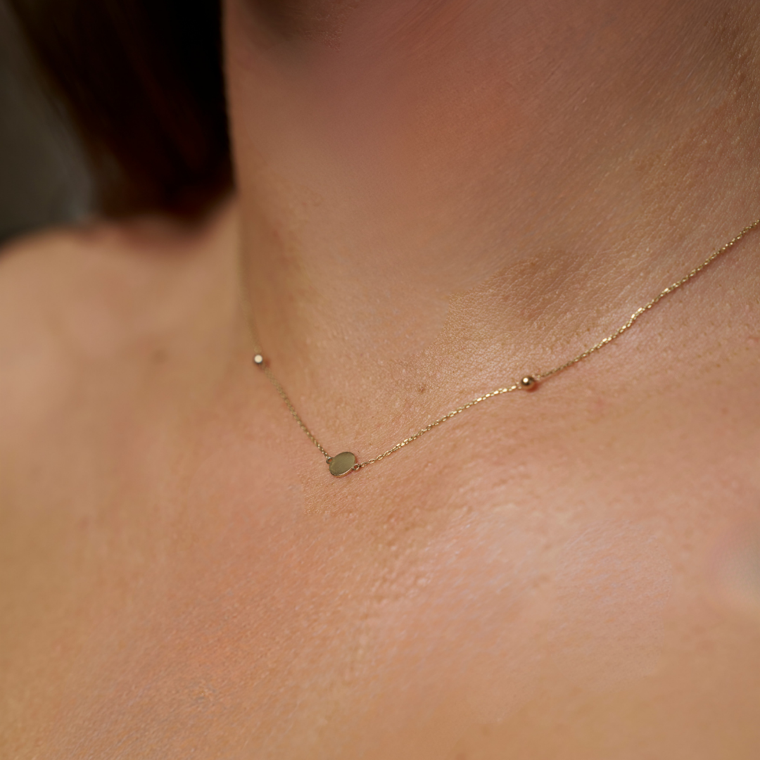 A timeless 9ct gold necklace featuring a delicate polished disc centred on a fine chain, accented with subtle gold ball stations for added texture. Its minimalist design makes it perfect for everyday wear, yet elegant enough to layer with your favourite pieces.