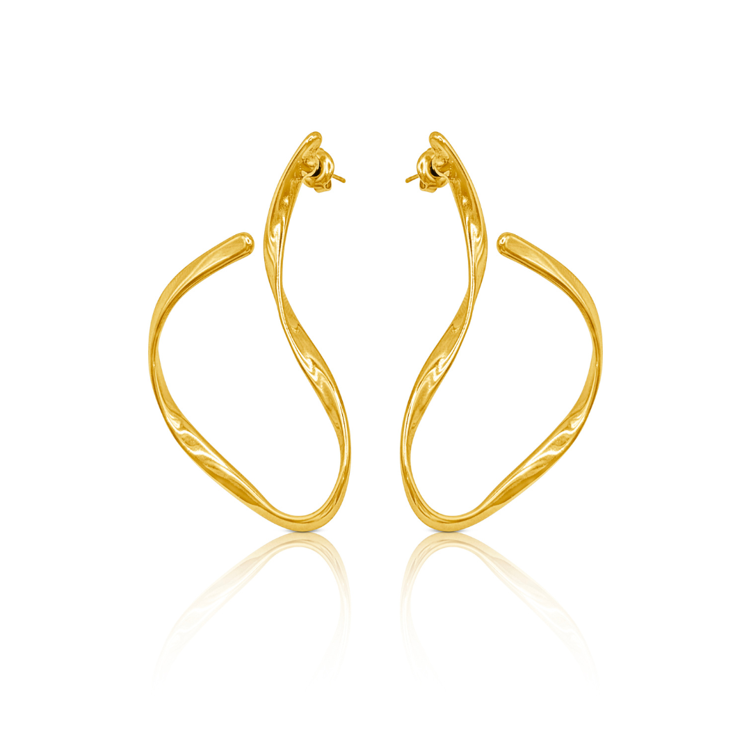 Sleek and sculptural, these gold-plated earrings feature a fluid, open design that moves beautifully with every wear. Their curved silhouette adds a touch of modern artistry, making them the perfect statement piece for both day and night. Lightweight and comfortable, they bring effortless sophistication to any outfit, a true blend of minimalism and impact.