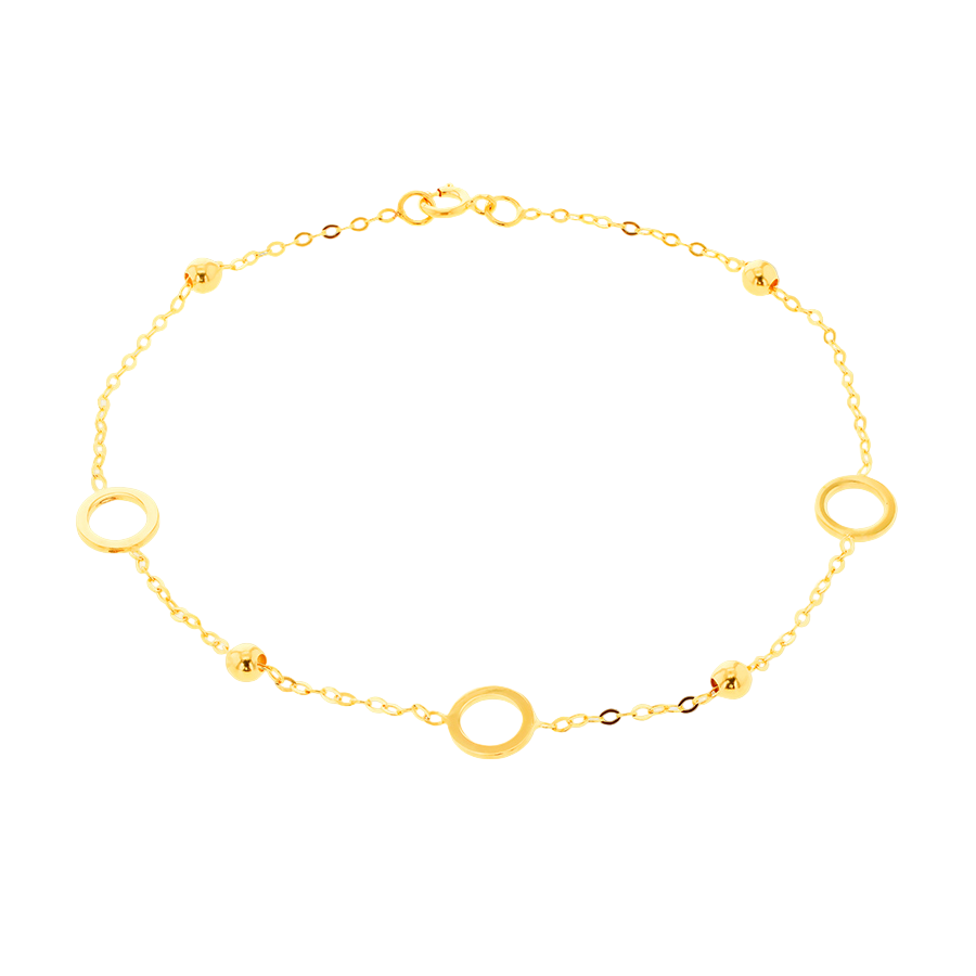 This elegant 9ct yellow gold bracelet features a polished design with delicate 6.5mm circles and 3mm beads, offering a refined balance of simplicity and charm. Measuring 7.5 inches in length and secured with a classic spring ring clasp, it’s a versatile accessory that enhances both casual and formal looks.