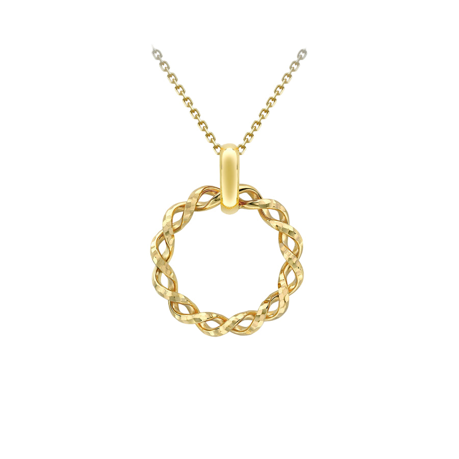 This elegant 9ct yellow gold necklace features a diamond-cut twist circle pendant measuring 17.5mm x 22mm, suspended from a fine 1mm chain. Adjustable between 17 and 18 inches with a secure lobster clasp, it offers versatility and a touch of modern sophistication, making it perfect for both everyday wear and special occasions.