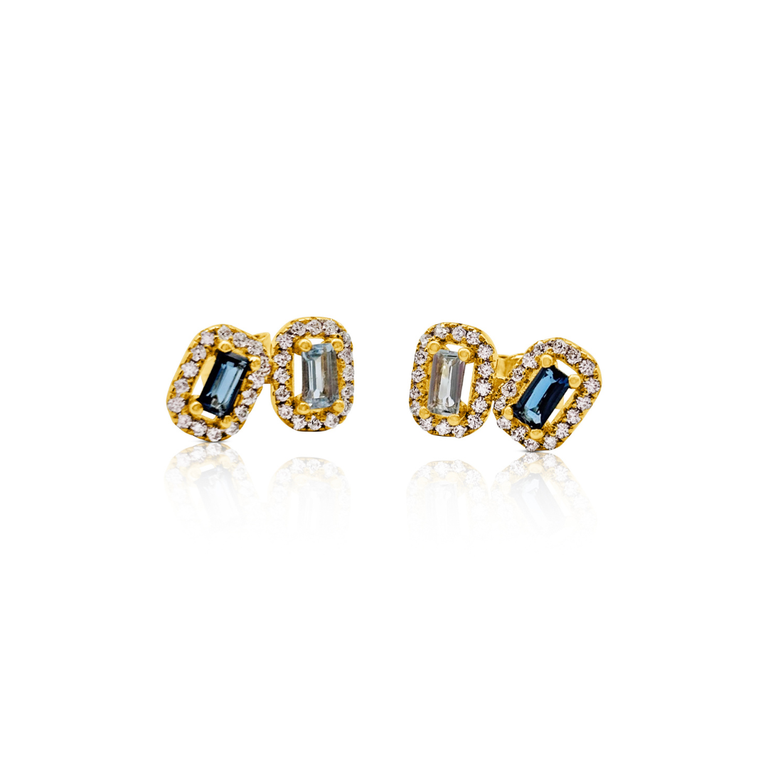 Radiant and refined, these 9ct gold stud earrings feature two exquisite gemstones, deep London Blue Topaz and light Sky Blue Topaz, each framed by a halo of sparkling CZ accents. The contrast between the rich and delicate blue tones creates a captivating play of colour and light, offering timeless sophistication with a modern touch. Perfect for both everyday wear and evening elegance, these earrings bring a graceful balance of luxury and versatility to any jewellery collection.